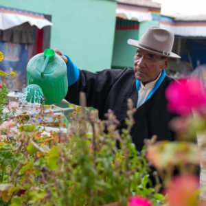 达瓦片多在院子里给花浇水(3月12日摄)。