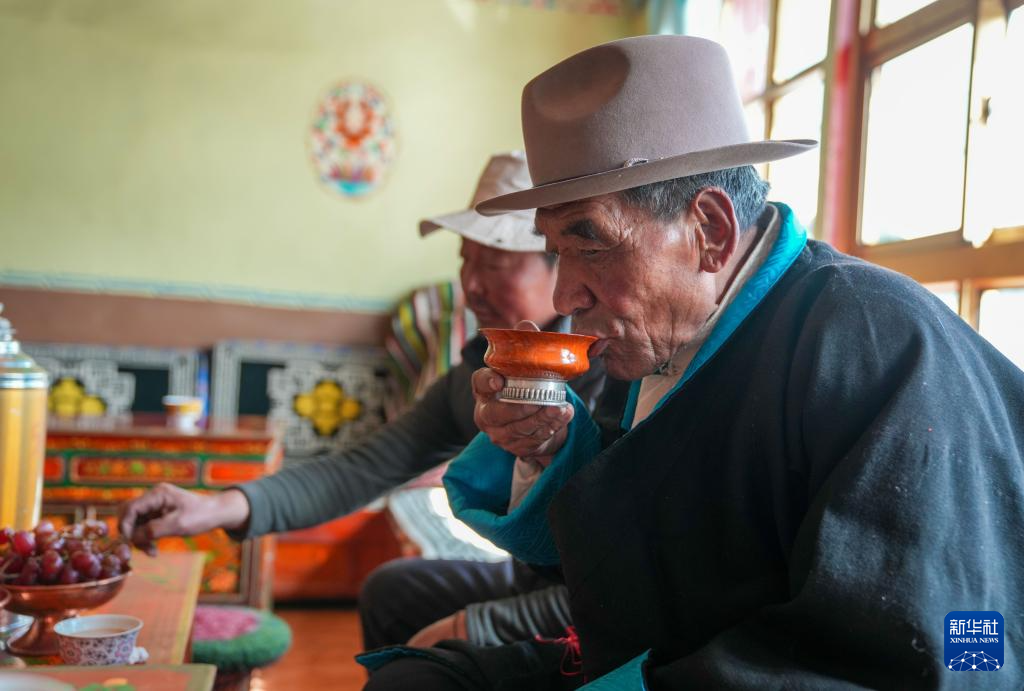 达瓦片多在家中喝酥油茶(3月12日摄)。