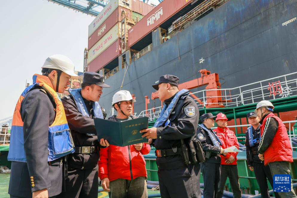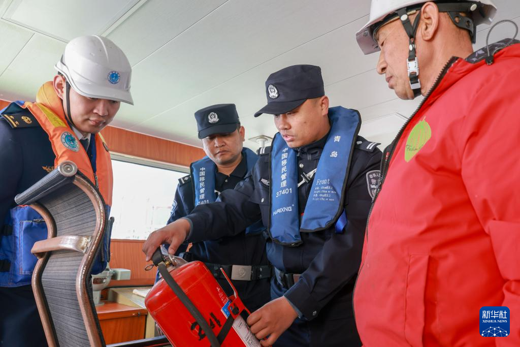 3月25日,执法人员在行动中检查船舶消防设备。