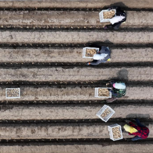 3月26日,河北省唐山市丰南区大新庄镇的农民在田间播种生姜(无人机照片)。