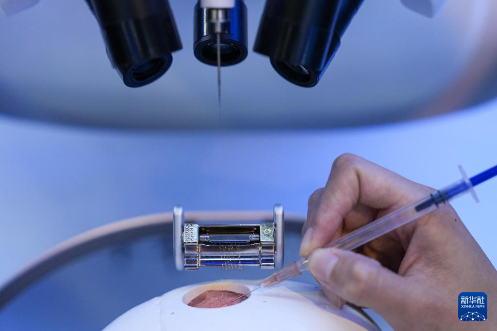 在中关村展示中心常设展上,工作人员在展示一款高通量柔性电极植入机器人植入的电极丝(3月25日摄)。