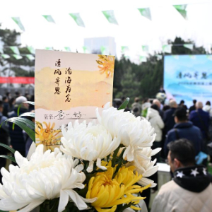 3月27日,在青岛市殡仪馆海葬广场,海葬逝者家属在追思活动启动仪式上献上寄语。