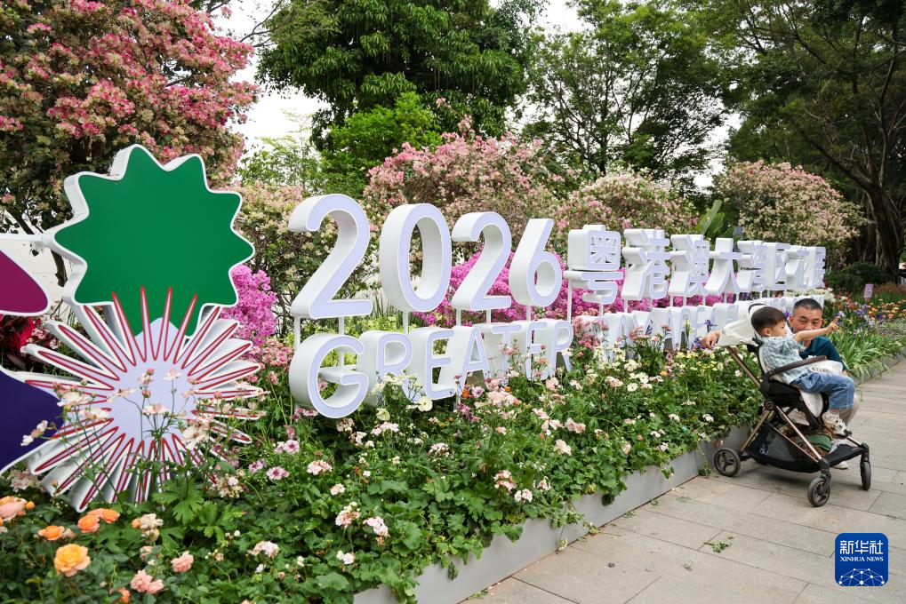 3月27日,游客在2026粤港澳大湾区花展现场拍照留念。