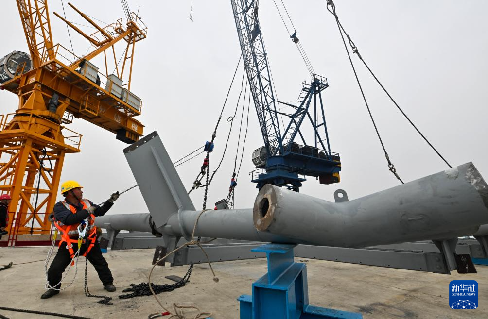 3月28日,天津“117项目”的菱形钢结构部件准备开始吊装。