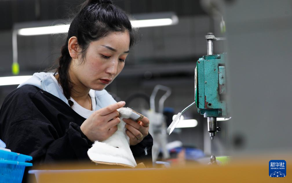3月27日,工作人员在河南省武陟县隆和鞋业公司车间内制作鞋面。
