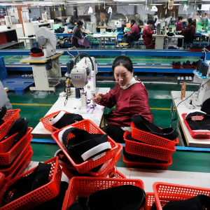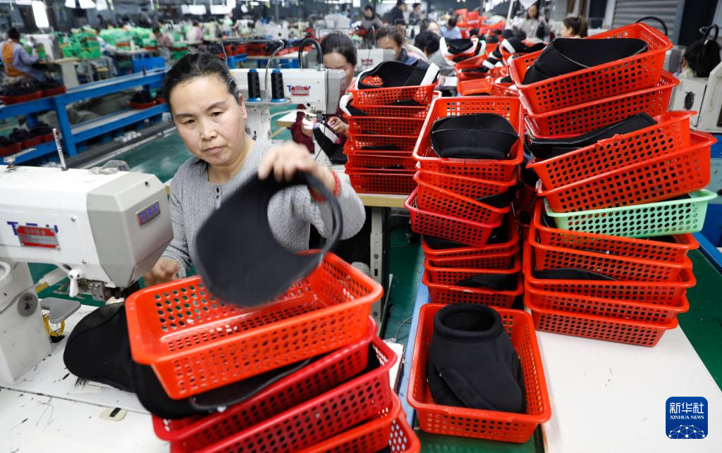 3月27日,工作人员在河南省武陟县一家鞋类外贸企业车间内加工物料。