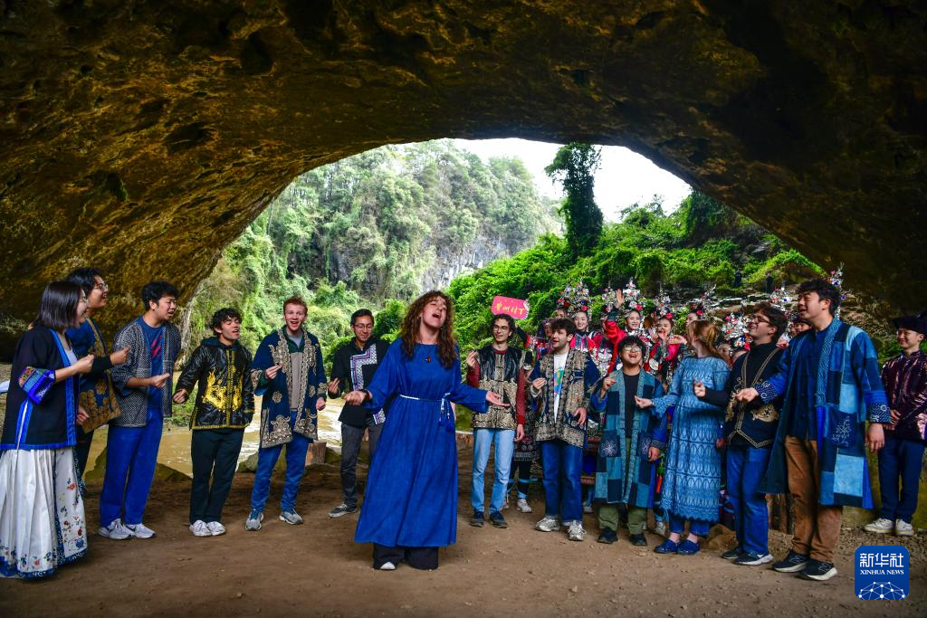 3月24日,在贵州省黎平县天生桥景区,美国耶鲁大学威芬普夫斯阿卡贝拉合唱团在演唱歌曲。
