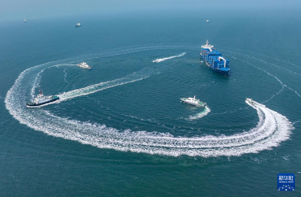 3月25日,执法船只进行海上应急处突演练(无人机照片)。