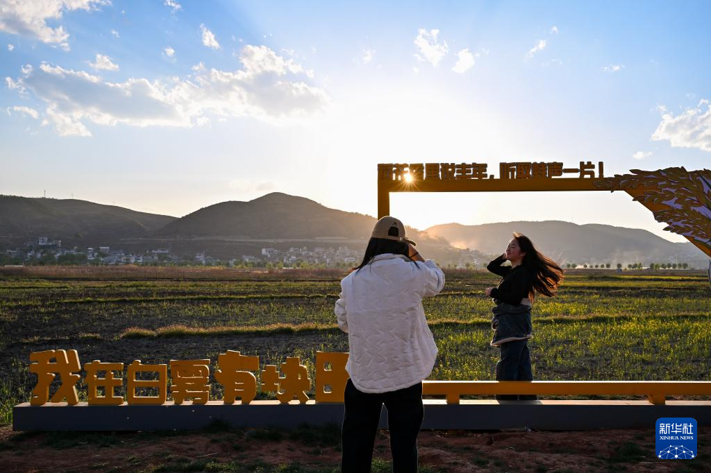 3月24日,游客在白雾村的田野间拍照留影。