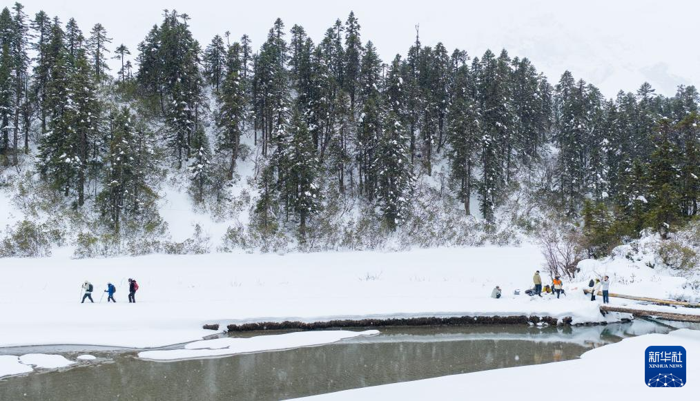 游人在白普隆沟牧场感受雪景(3月21日摄,无人机照片)。
