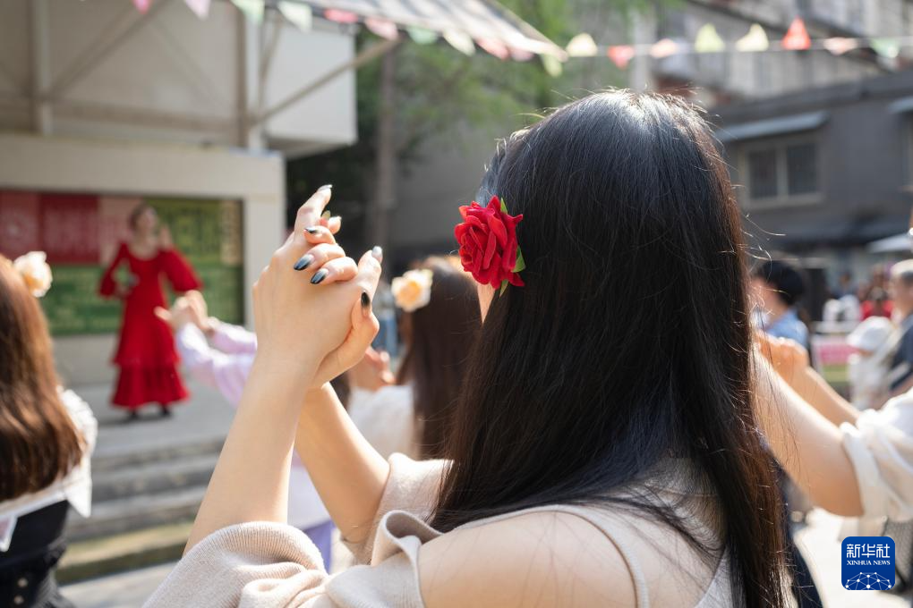 3月28日,观众在成都市玉林社区广场与戏剧演员互动。