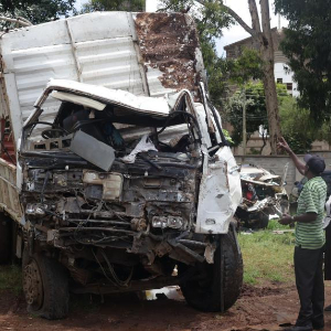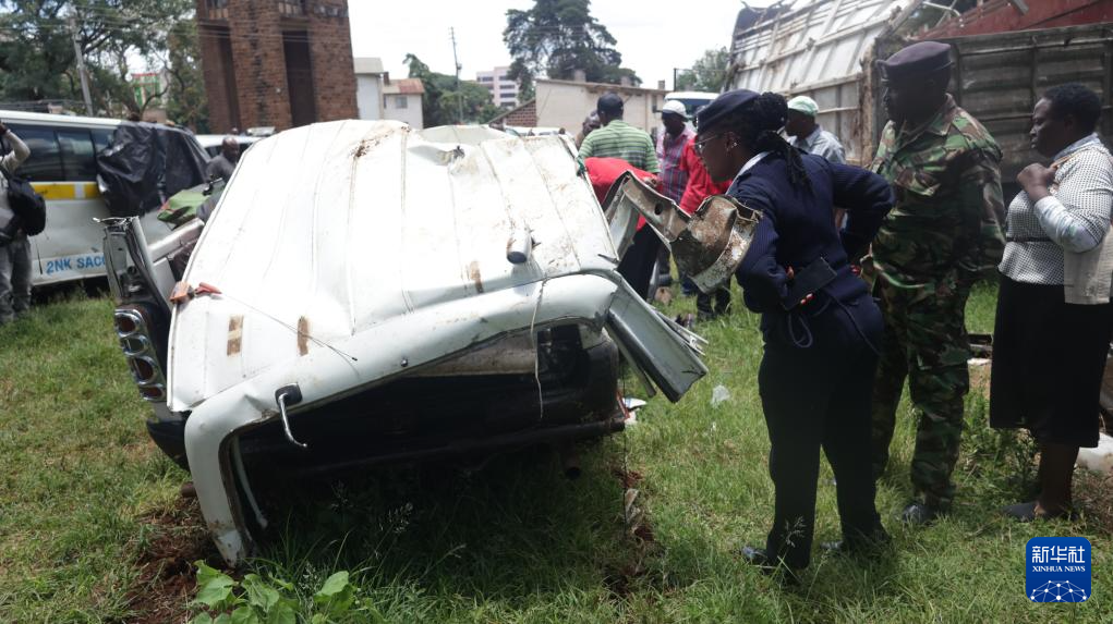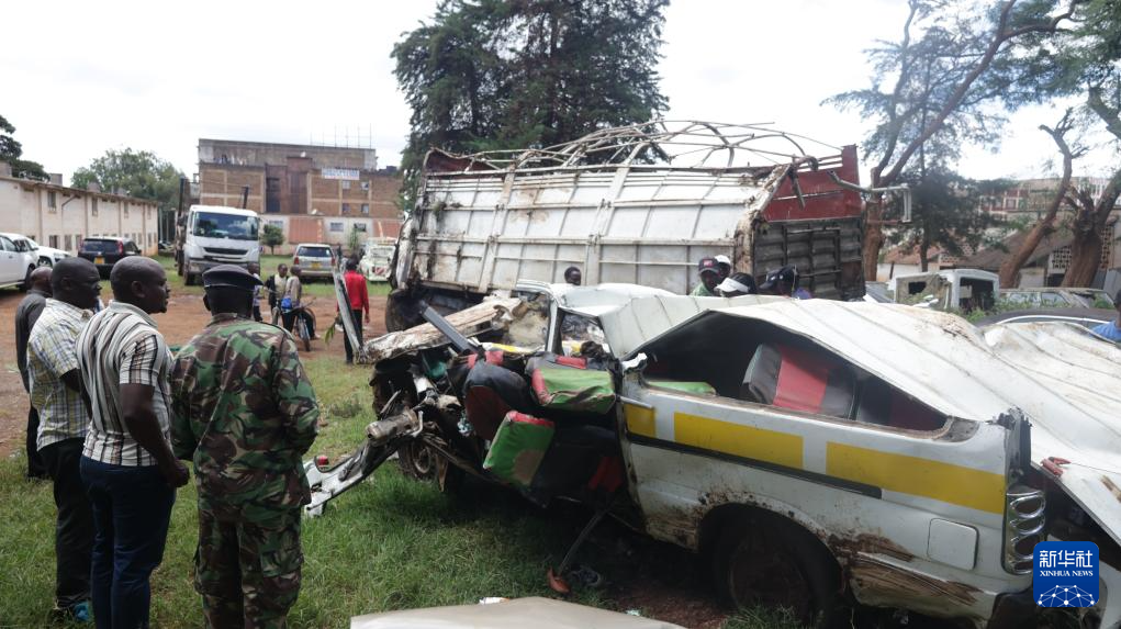 这是3月29日在肯尼亚中部涅里郡拍摄的在交通事故中损毁的车辆。