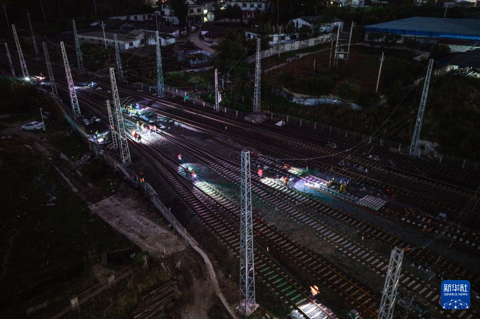 3月30日晚,工人在贵州瓮马铁路南北延伸线绿荫湖站改造工程现场施工(无人机照片)。