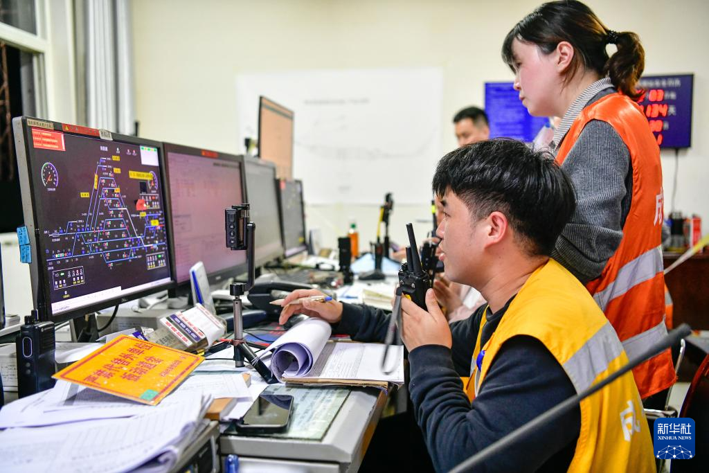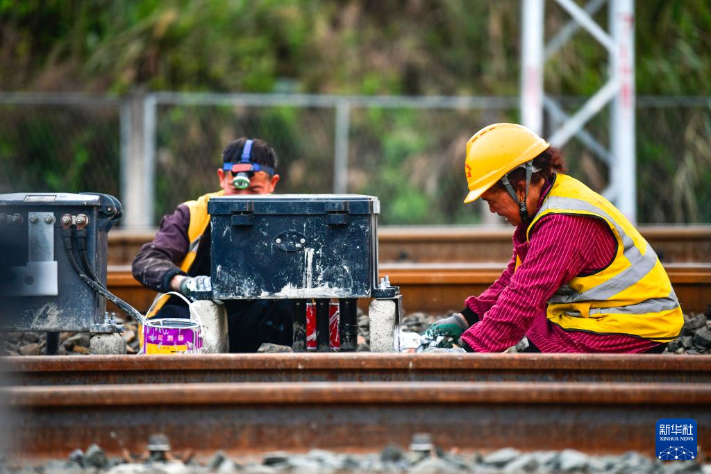 3月30日,工作人员在贵州瓮马铁路南北延伸线绿荫湖站改造工程现场进行信号联锁试验。