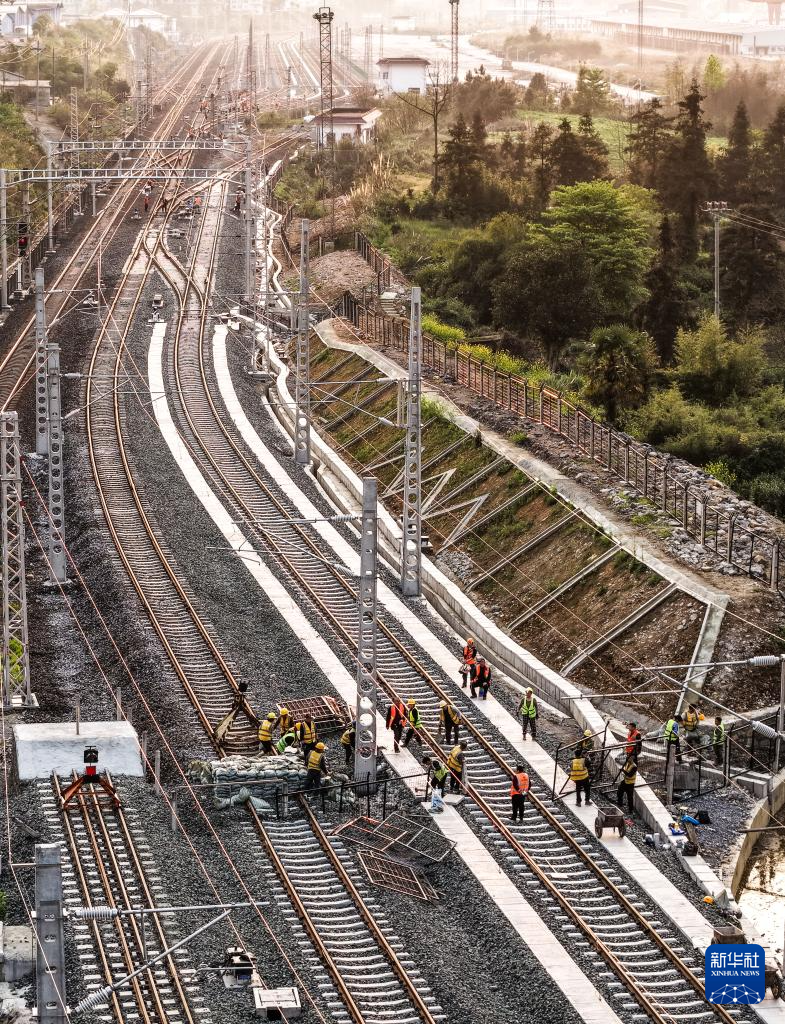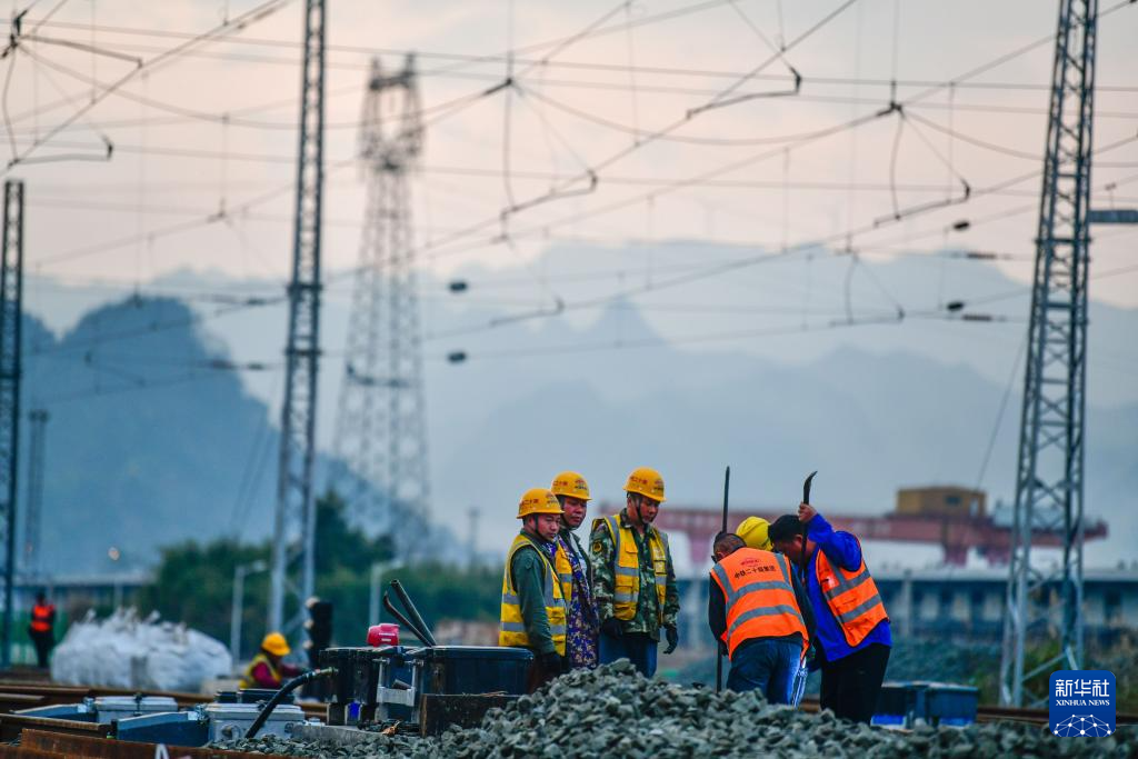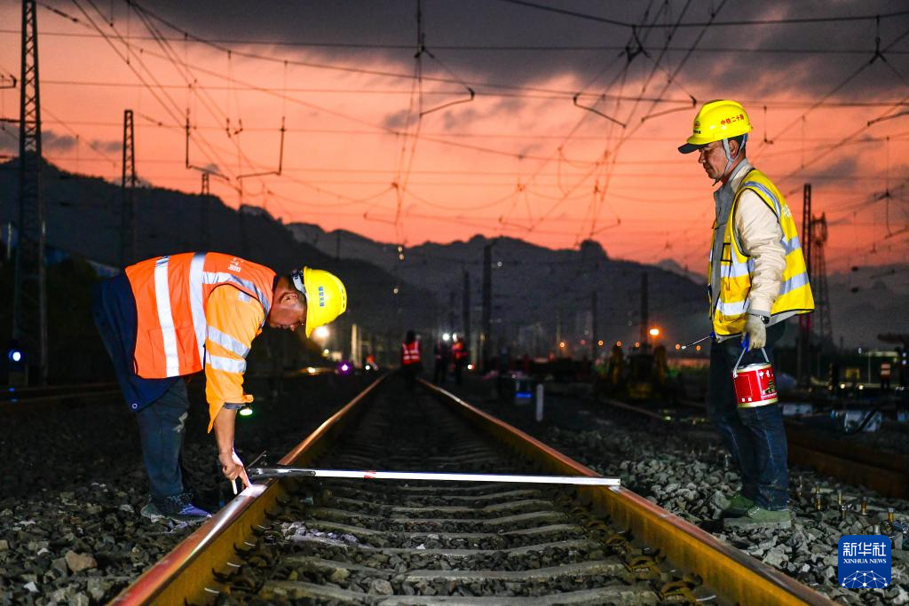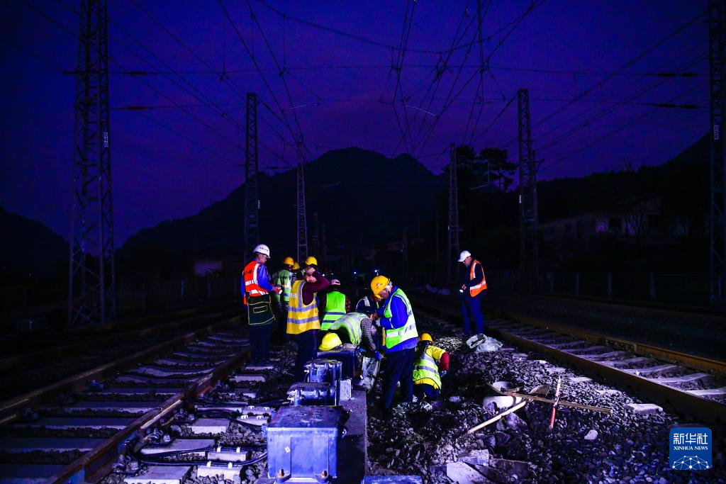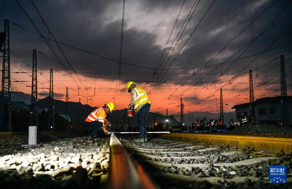 3月30日晚,工人在贵州瓮马铁路南北延伸线绿荫湖站改造工程现场施工。