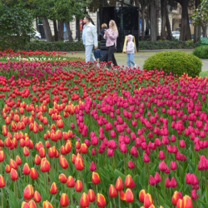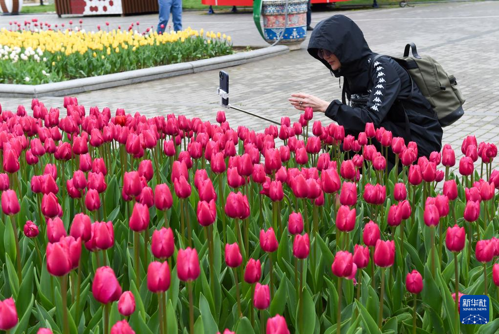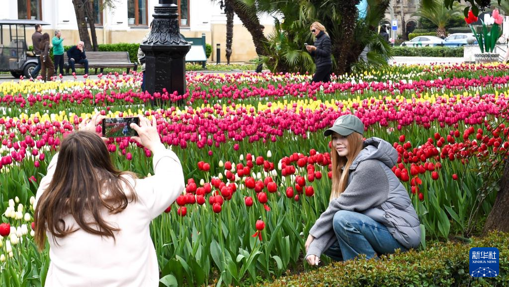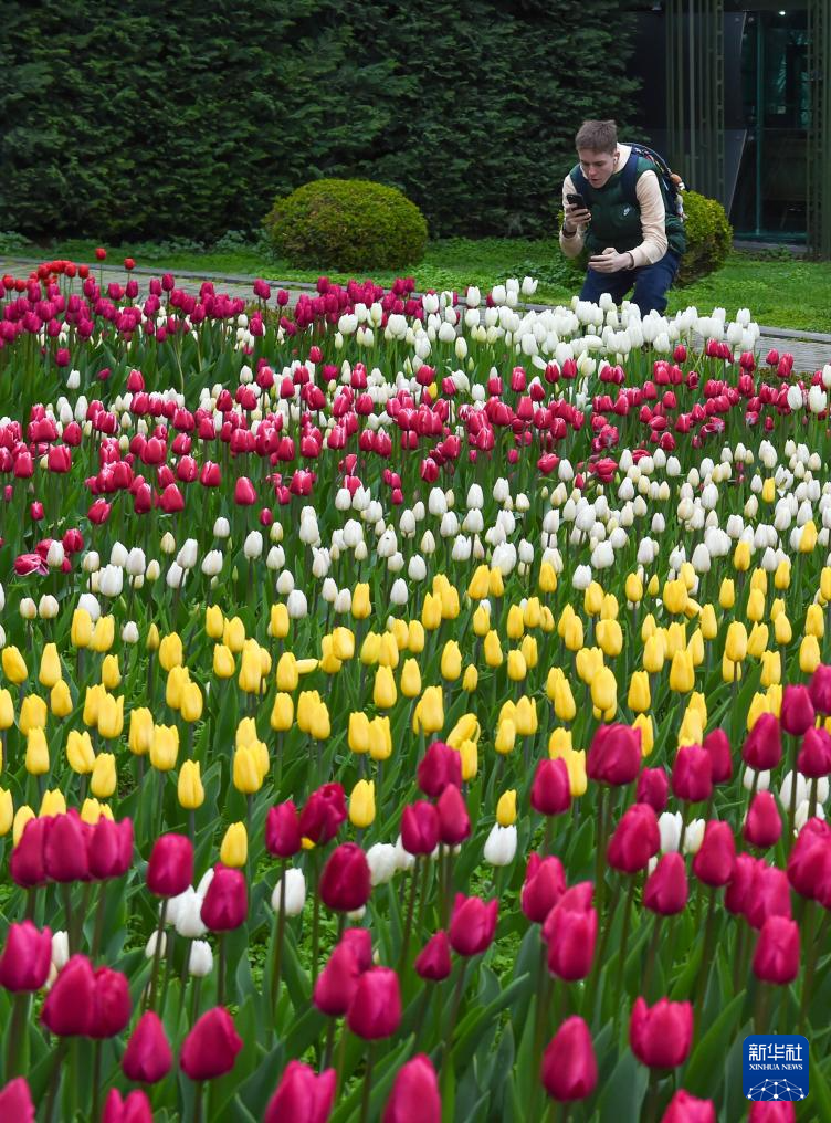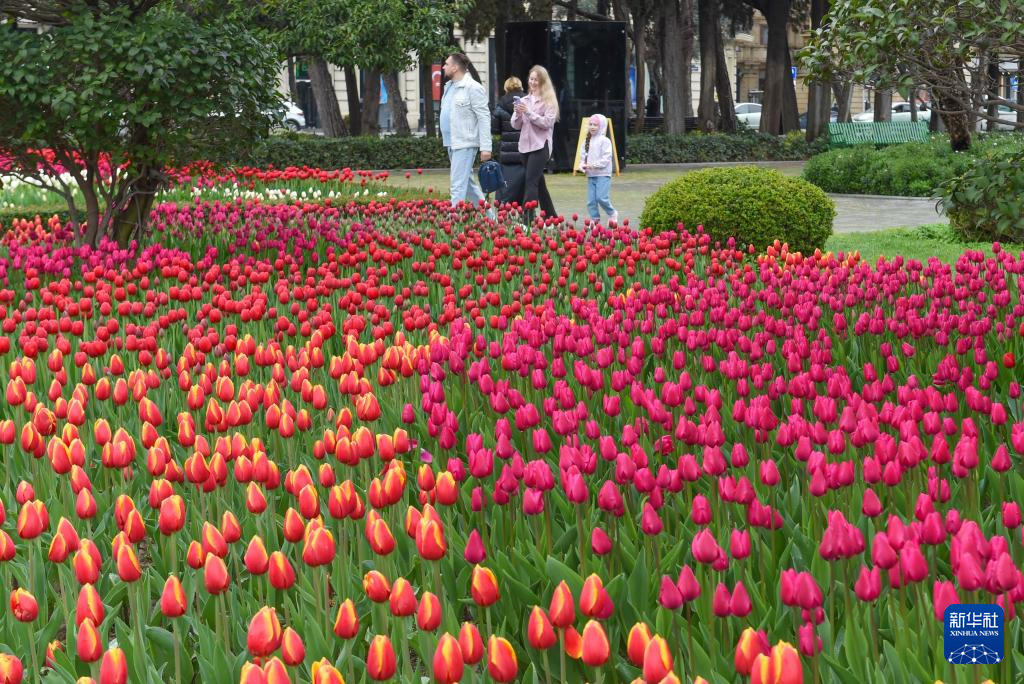近日,位于阿塞拜疆首都巴库的海滨公园春意盎然,郁金香竞相绽放,吸引游客驻足欣赏、拍照留念。