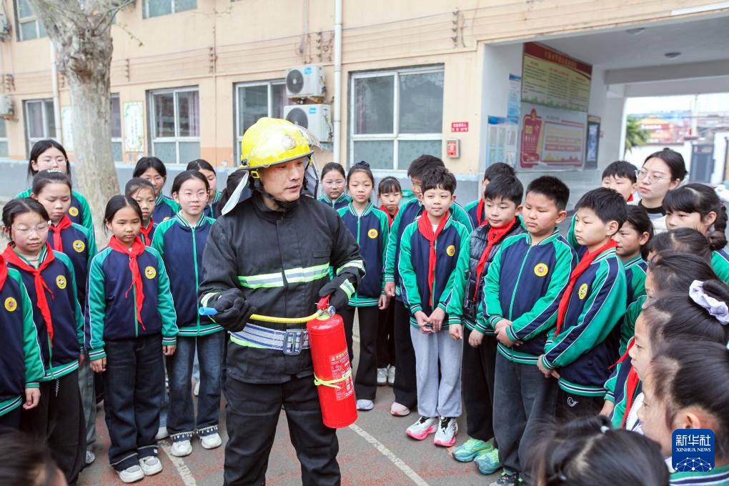 3月30日,在河南省焦作市博爱县清化镇街道七街小学,校园安全员为学生们讲解消防器材使用知识。