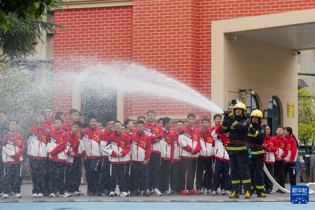 3月30日,四川省眉山市彭山区消防救援局工作人员为彭山区第三中学学生展示消防水枪。