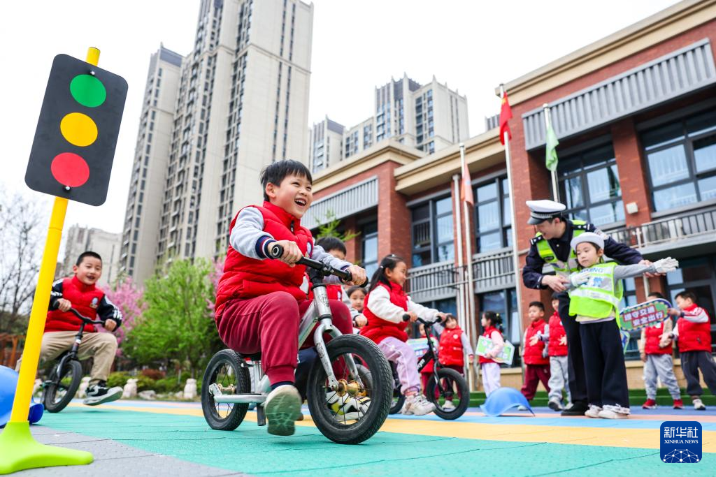3月30日,在河北省石家庄市新华区柏林幼儿园,小朋友们在交警指挥下进行“红绿灯过马路”交通游戏。