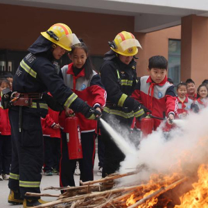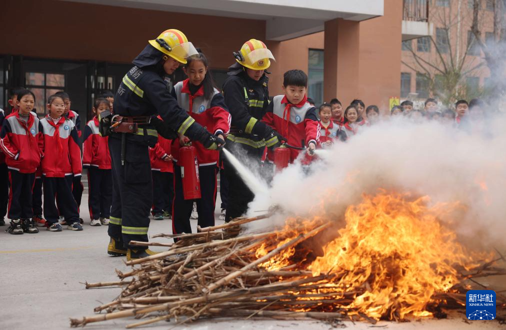 3月30日,在山东省临沂市沂南县第六实验小学,消防救援人员指导学生正确使用灭火器灭火。