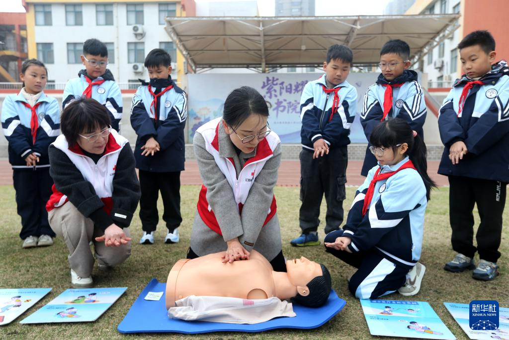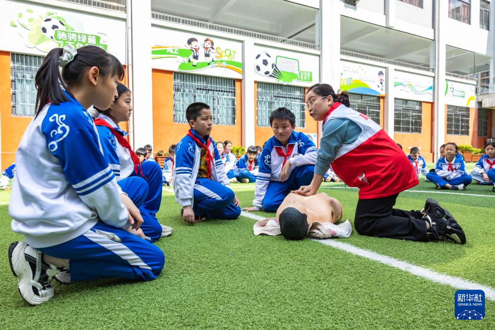 3月30日,红十字会工作人员在贵州省安顺市第七小学指导学生学习心肺复苏。