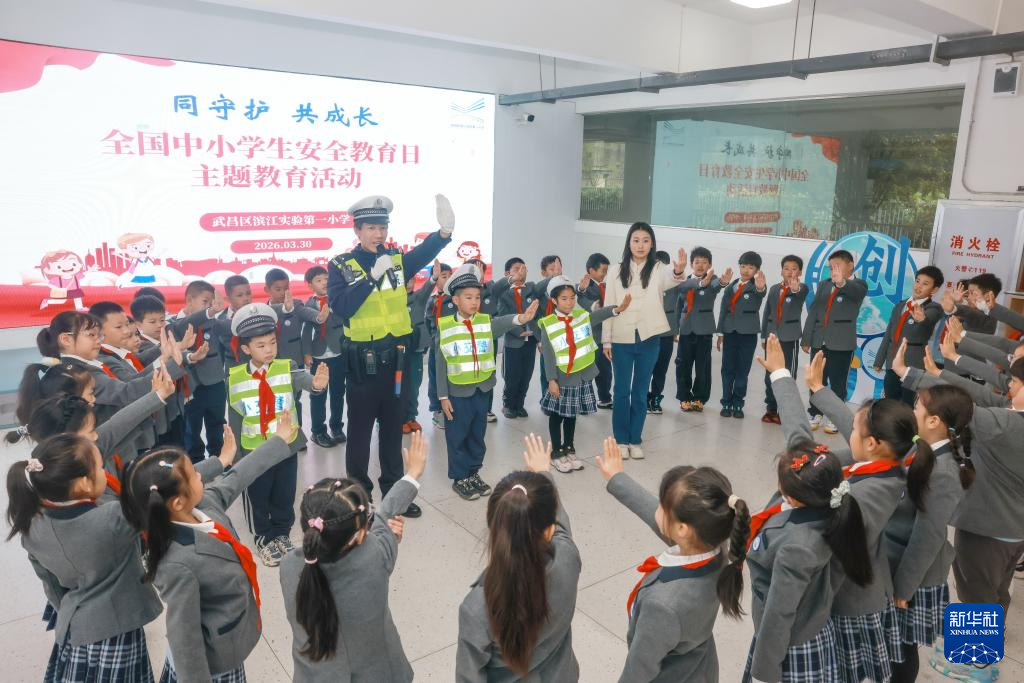 3月30日,在湖北省武汉市武昌区滨江实验第一小学,交警指导学生体验交通安全手势操。
