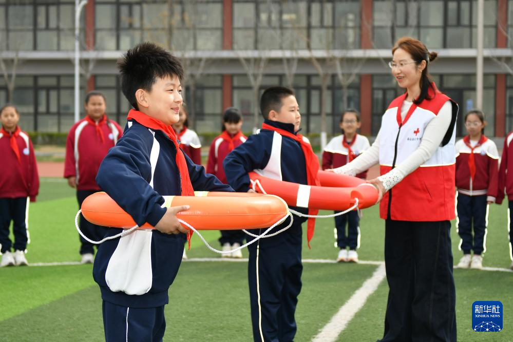 3月30日,在山东省烟台市福山区芝阳山学校,志愿者指导学生正确使用救生圈。