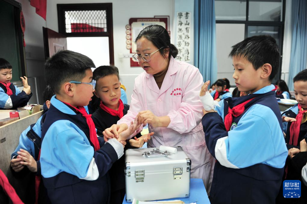 3月30日,湖北省宜昌市秭归县实验小学校医在教学生们救护包扎知识。