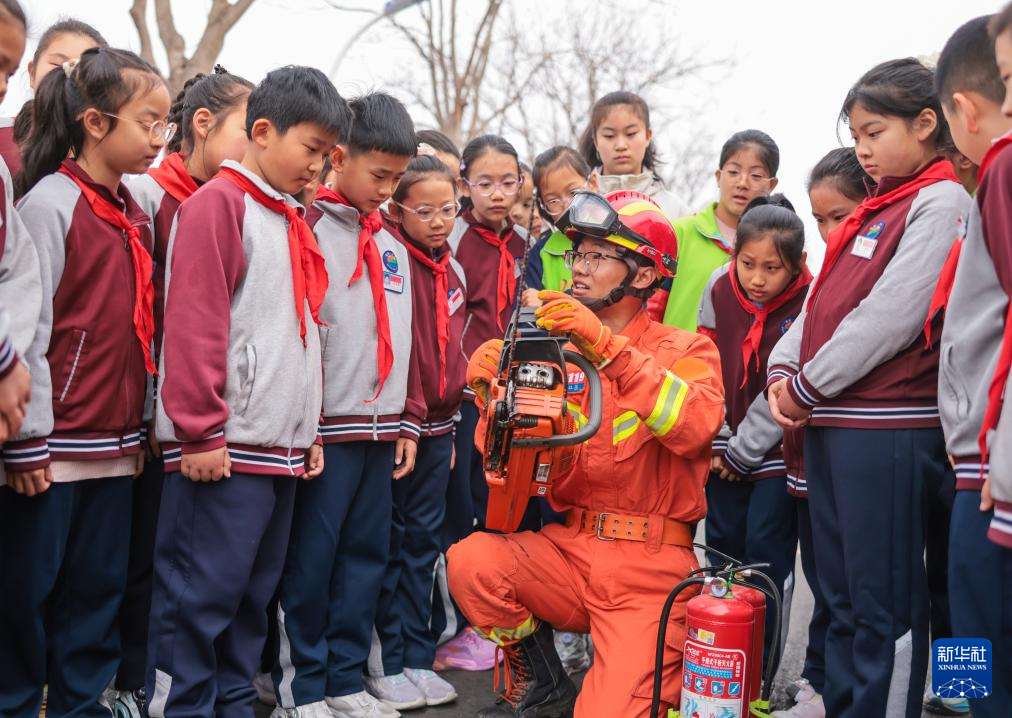 3月30日,在山东省荣成市府新小学,消防救援人员为学生展示消防破拆工具的使用方法。