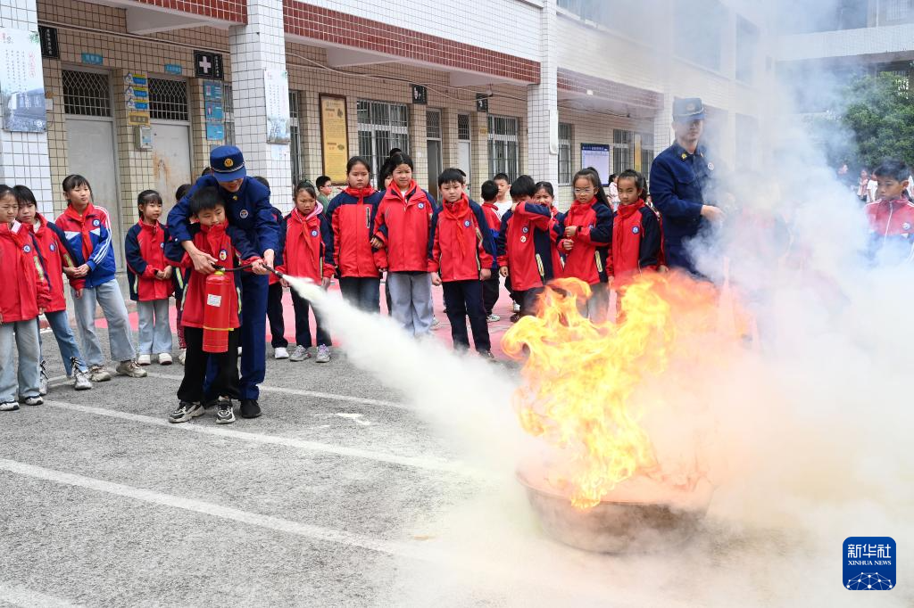 3月30日,在四川省内江市东兴区郭北镇中心学校,东兴区消防救援局工作人员指导学生使用灭火器。