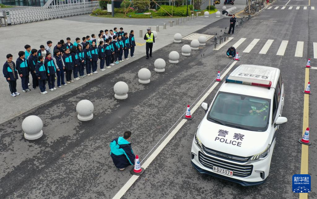 3月30日,在浙江省金华市第四中学长湖湾校区附近封闭道路,民警指导学生测量车辆不同速度的刹车制动距离(无人机照片)。