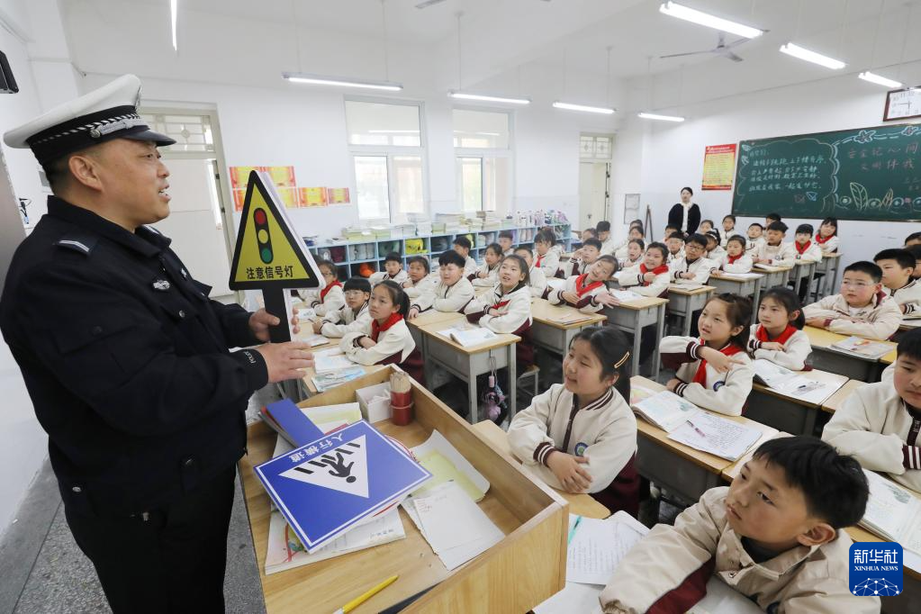 3月30日,在河南省焦作市温县第三实验小学,一名协警为学生讲解交通标识。