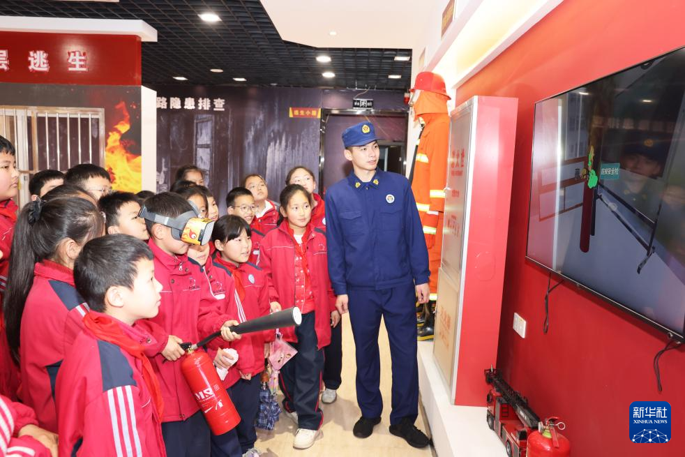 3月30日,在河南省济源市沁园路小学,消防救援人员指导学生正确使用灭火器。