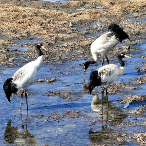 3月29日,黑颈鹤在嘎曲河红原县月亮湾段觅食。