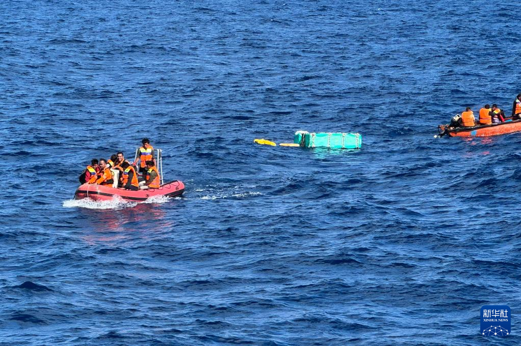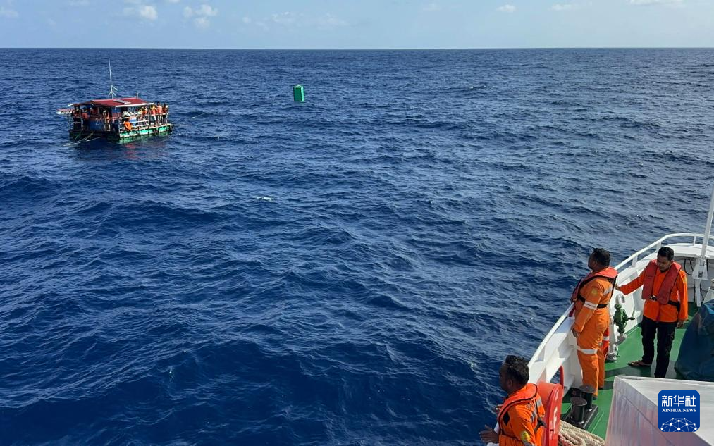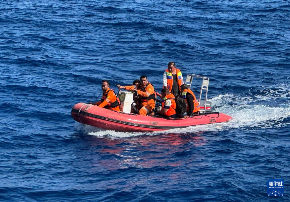 3月31日,在印度尼西亚北苏拉威西省附近海域,救援人员靠近载有幸存船员的备用艇。