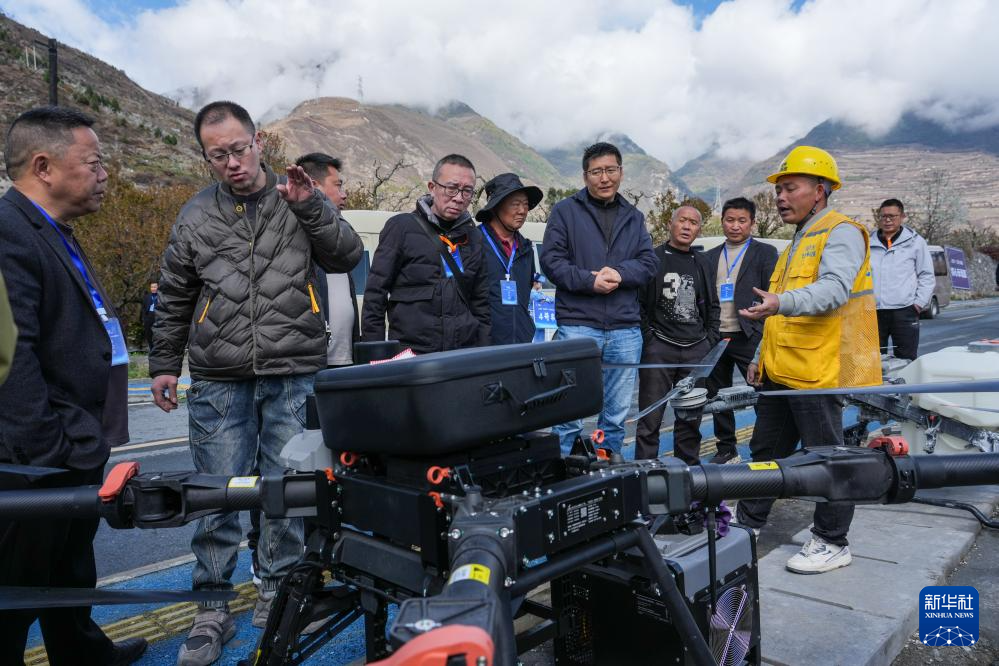 3月31日,在四川茂县“茂县李”标准化种植基地,参会专家和客商在了解无人机植保情况。