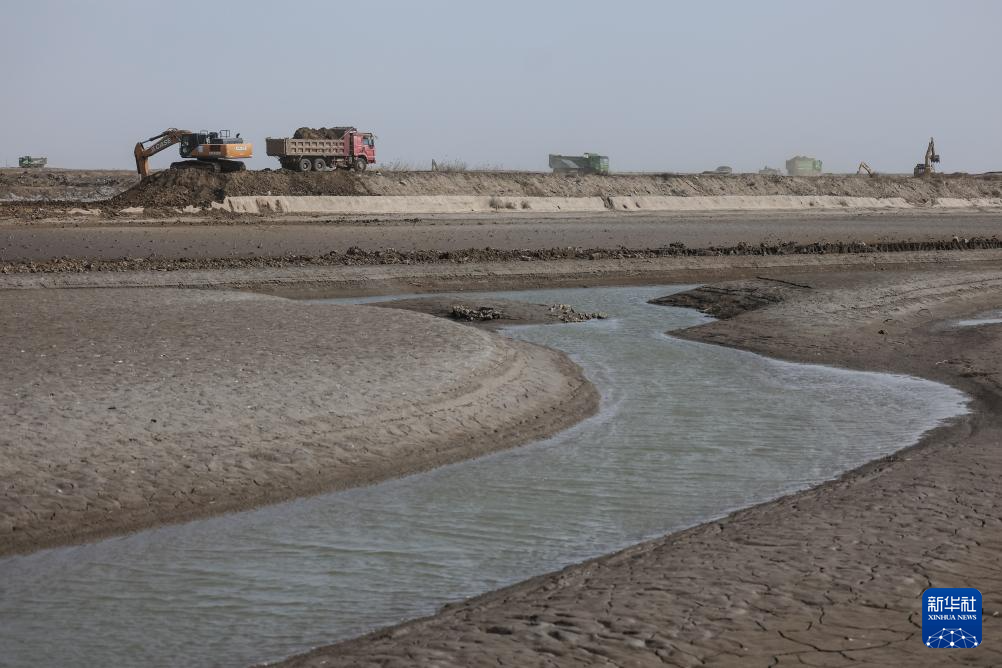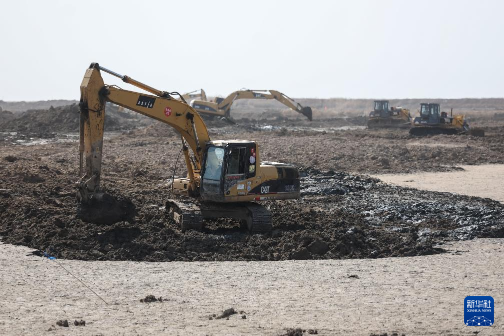 4月1日,大型机械在湿地修复工作现场作业。