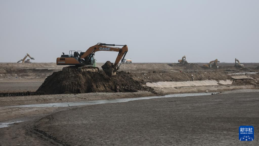 春日,在辽宁辽河口国家级自然保护区内,数台大型机械有序开展地形修复作业。这里是盘锦市海洋生态保护修复工程项目的施工现场。
