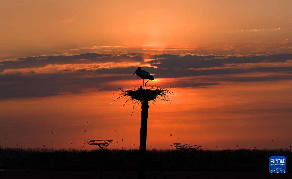 这是4月1日在黑龙江省肇东市千鹤岛旅游风景区拍摄的晨光中的东方白鹳(无人机照片)。