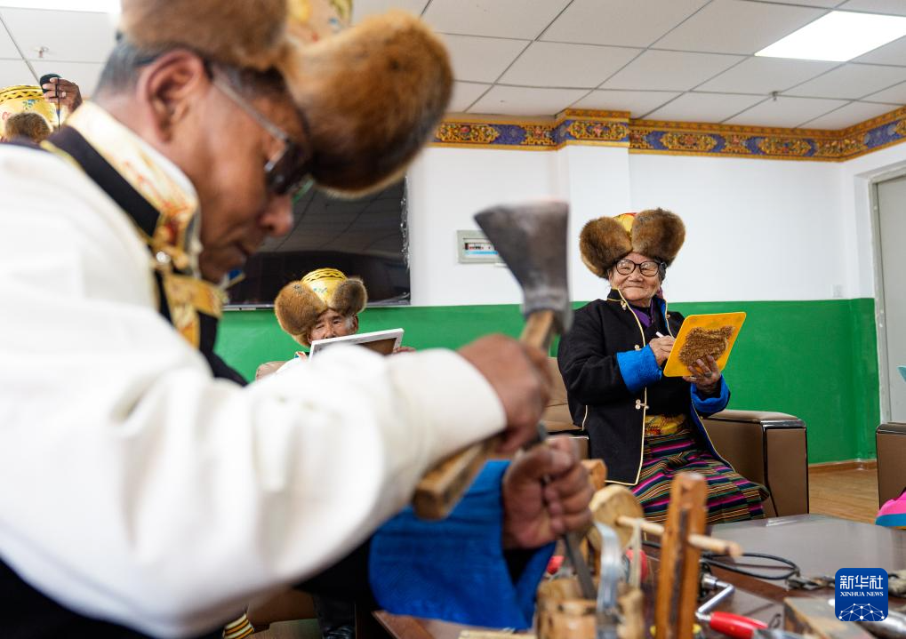 次德吉(右)在山南市桑日县特困人员集中供养中心和其他老人上手工课(3月25日摄)。