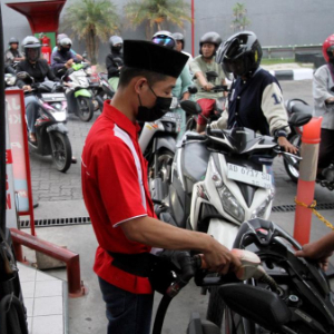 3月31日,在印度尼西亚梭罗,工作人员为摩托车加油。