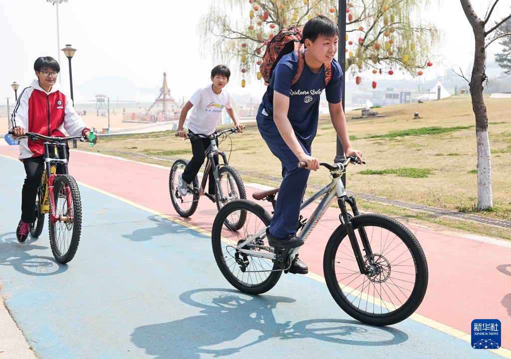 4月1日,在江苏省连云港市在海一方公园,几名初中生结伴在户外骑行。