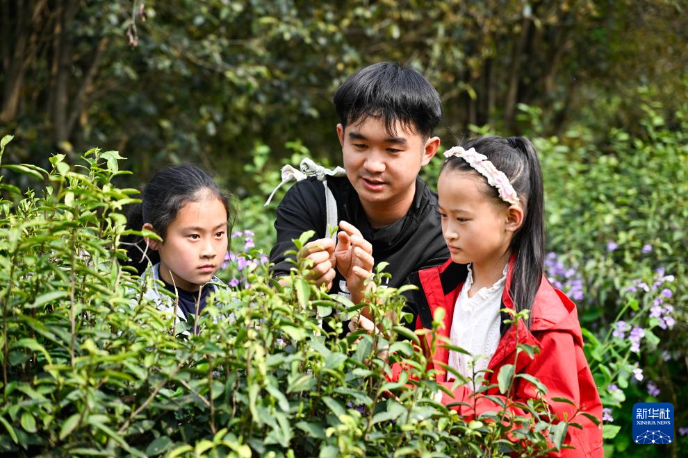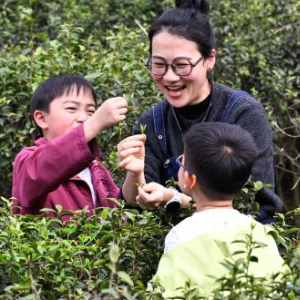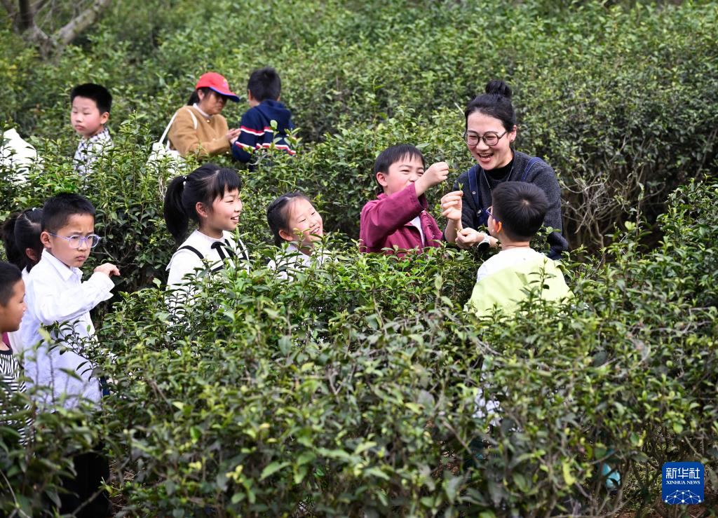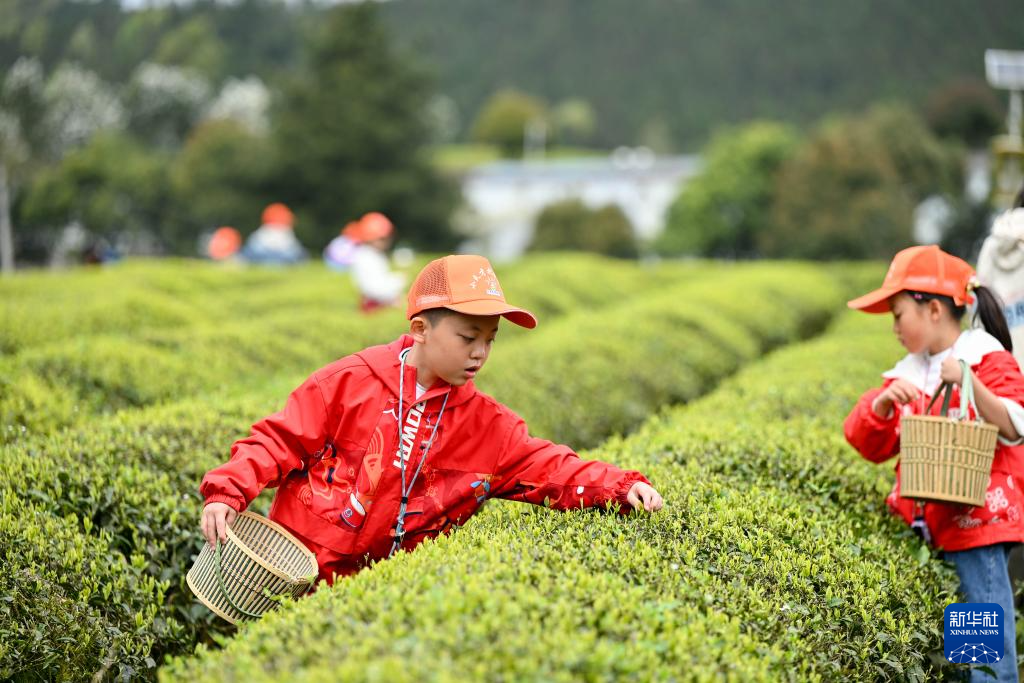 4月1日,小朋友在贵州省贵阳市开阳县龙岗镇坝子村生态茶园体验采摘春茶。
