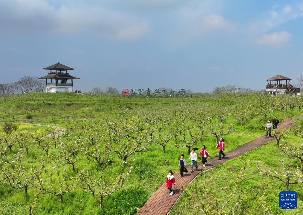 4月1日,小朋友在湖南省衡阳市珠晖区金甲梨园踏青游玩,乐享春假好时光(无人机照片)。