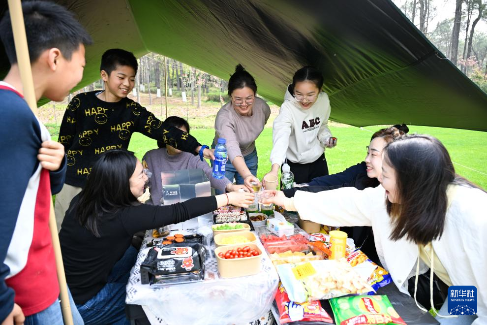 4月1日,小学生和家长在位于江苏省句容市的江苏农博园露营。