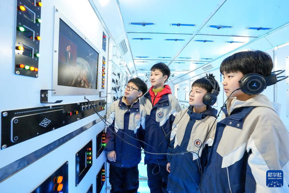 4月1日,在江苏省盐城市射阳县日月岛航天科技科普中心,射阳县海都实验小学的孩子们在模拟太空舱内参观。