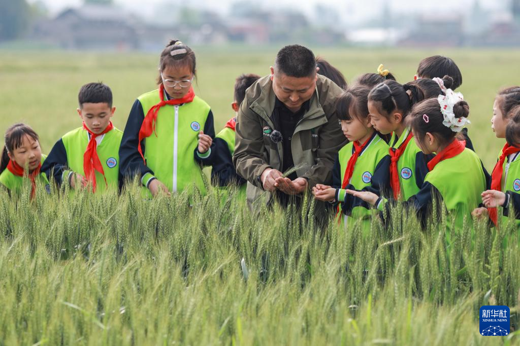 4月1日,在四川省眉山市彭山区观音街道兴崇社区千亩粮油基地,农业技术人员在田间为鹏利小学学生科普小麦播种技术、生长周期及现代农业科技应用等知识。