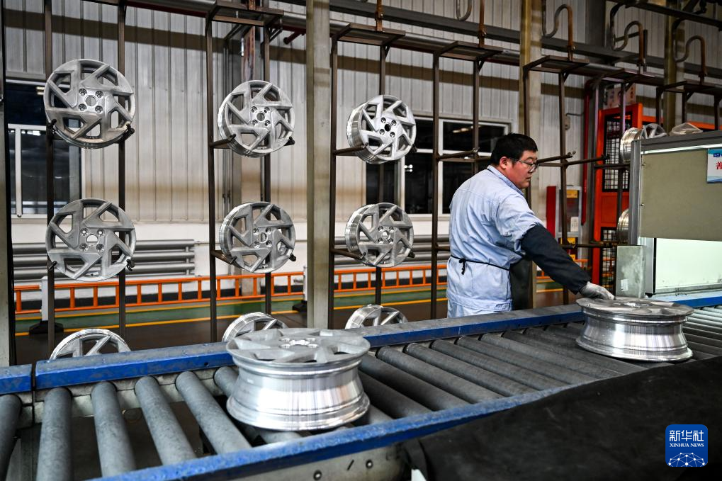 4月1日,工人在包头盛泰汽车零部件制造有限公司铝合金轮毂生产线上作业。