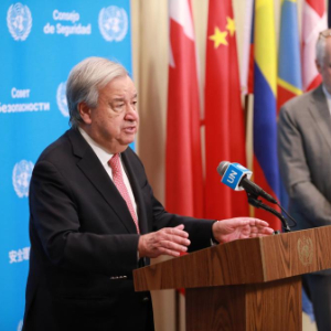 4月2日,联合国秘书长古特雷斯在位于纽约的联合国总部举行的记者会上讲话。