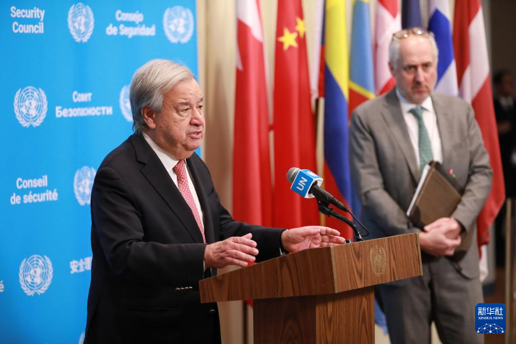 4月2日,联合国秘书长古特雷斯(左)在位于纽约的联合国总部举行的记者会上讲话。